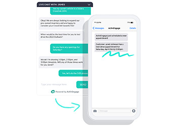 Transform the way you connect with today’s car buyers by using the most comprehensive automotive messaging solution on the market. With ActivEngage, your dealership can have conversations across all your digital channels that increase engagement, leads, appointments and sales.