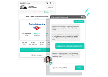 Add messaging to your digital retailing tool for a guided online car buying experience! Our professionally-trained team (or yours) can help move consumers down-funnel by answering questions in real-time and building buyer confidence that increases completion.
