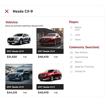 Our new homepage site search goes from 0 to 60 faster than any other platform out there. Once users type a single letter, our site search intelligently displays a dynamic knowledge graph with relevant VDPs, inventory feeds, and pages, instantly giving visitors what they came for, and leading them towards conversions.