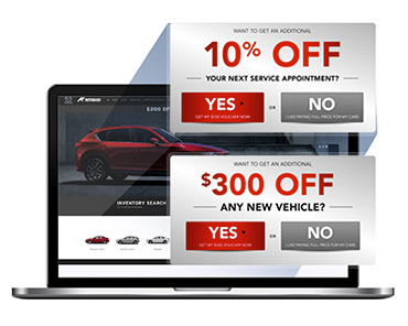 DealerOn’s Behavioral Targeting System (BTS) is a state-of-the-art lead generation enhancement system designed to increase the number of leads and service appointments by delivering contextually relevant offers to consumers as they leave a dealer’s website. As an example – A consumer visits a Mazda dealer’s website, peruses the hours of the Service Department, checks out their Service Reps experience, and then leaves the site. Using patent-pending technology, BTS detects the consumer’s mouse moving to abandon the website, and dynamically serves up a 10% off Service offer (or whatever Service offer the dealer wanted to leverage).