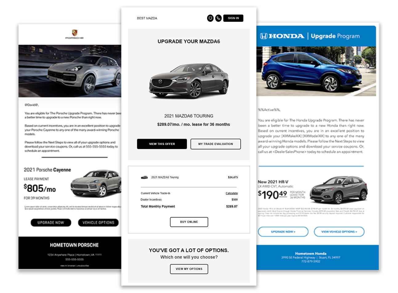 Move customers down the funnel with trigger emails designed to convert passive shoppers into active leads. These automated emails precisely re-engage shoppers based on dozens of specific customer actions. For example, after visiting your website, customers will receive an email with a personalized offer on the exact vehicle they shopped for. On the service side, customers will receive an email before their upcoming appointment with customized upgrade offers and vehicle appraisal options. Smart Emails are 100% automated with personalized content tailored to every customer. These dynamic emails are impossible for CRM’s or humans to create and have 26% higher open rates than traditional emails.